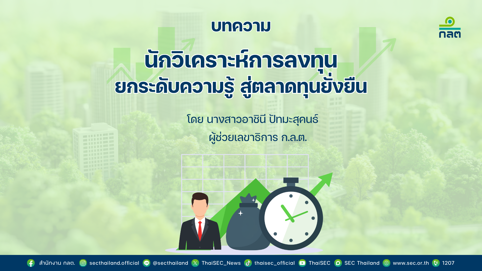จากบทความ "นักวิเคราะห์การลงทุน ยกระดับความรู้ สู่ตลาดทุนยั่งยืน" โดยนางสาวอาชีนี ปัทมะสุคนธ์ ผู้ช่วยเลขาธิการ สำนักงานคณะกรรมการกำกับหลักทรัพย์และตลาดหลักทรัพย์ (ก.ล.ต.)  ในคอลัมน์ "เล่าให้รู้กับ ก.ล.ต." หนังสือพิมพ์ประชาชาติธุรกิจ