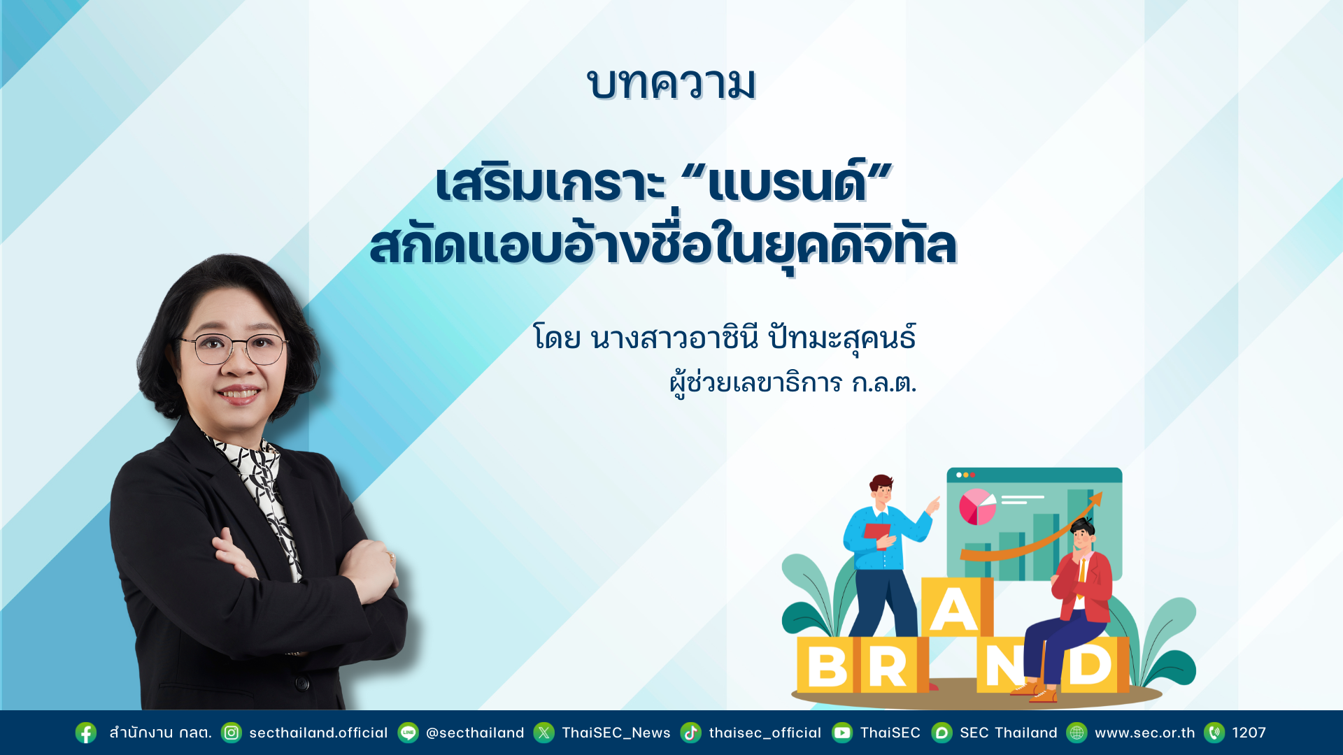 จากบทความ "เสริมเกราะ “แบรนด์” สกัดแอบอ้างชื่อในยุคดิจิทัล​" โดยนางสาวอาชีนี ปัทมะสุคนธ์ ผู้ช่วยเลขาธิการ สำนักงานคณะกรรมการกำกับหลักทรัพย์และตลาดหลักทรัพย์ (ก.ล.ต.)  ในคอลัมน์ "ชวนคิดชวนคุยกับ ก.ล.ต." เว็บไซต์ข่าวหุ้นธุรกิจออนไลน์