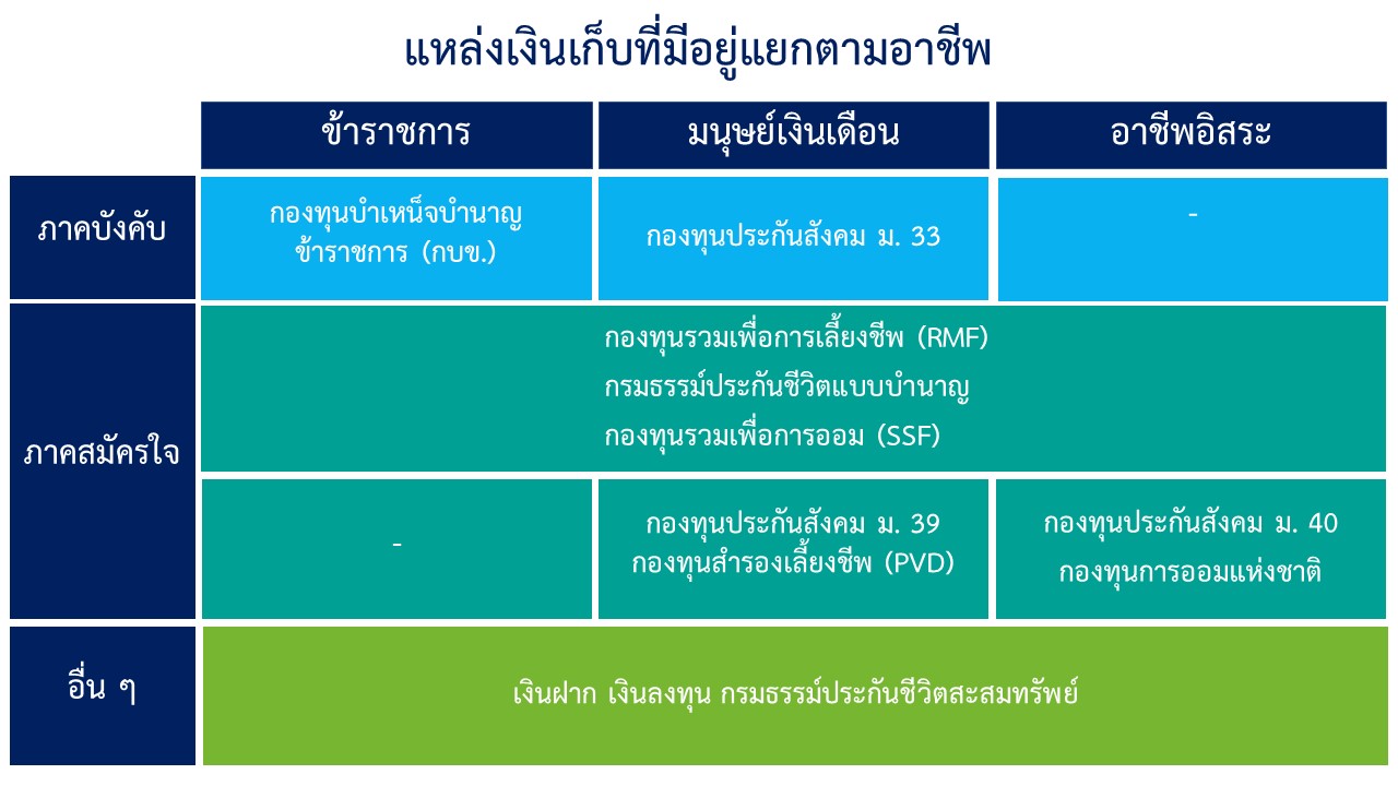 อาชีพอิสระที่ไม่มีนายจ้าง อาจจะแตกต่างกับข้าราชการหรือมนุษย์เงินเดือน แต่ภาครัฐก็ให้การสนับสนุนในเรื่องของการออมเพื่อการเกษียณ ผ่านกองทุนประกันสังคม ม.40 ทางเลือกที่ 2 และ 3 ที่ภาครัฐช่วยสมทบเงินให้ หรือกองทุนการออมแห่งชาติ (กอช.) ซึ่งเป็นการที่เราและภาครัฐช่วยกันสะสมเงิน ซึ่งถ้าเริ่มออมใน กอช. ตั้งแต่อายุ 15 ปี จนถึง 60 ปี ออมเงินเดือนละ 1,100 บาท หลังเกษียณจะมีเงินบำนาญใช้ 7 พันกว่าบาทต่อเดือน และสำหรับคนที่มีรายได้สูงขึ้นมาก็มี RMF และ SSF เป็นทางเลือกออมเพื่อเกษียณที่ใช้ลดหย่อนภาษีได้ด้วย