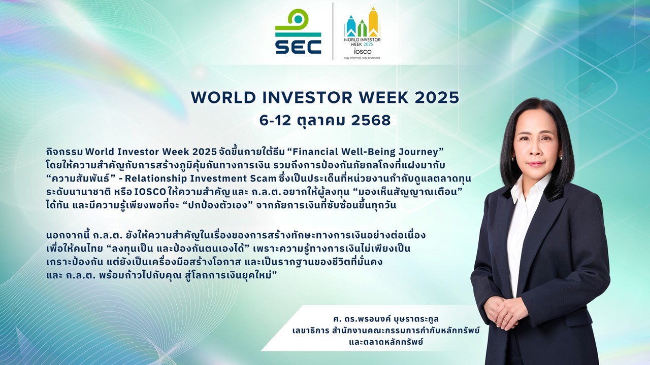 นางพรอนงค์ บุษราตระกูล เลขาธิการ เลขาธิการ ก.ล.ต. กล่าวว่า "กิจกรรมสัปดาห์ส่งเสริมความรู้ผู้ลงทุนสากลในปีนี้ จัดขึ้นในช่วงวันที่ 6 –12 ตุลาคม 2568 ภายใต้แนวคิด “Financial Well-Being Journey: รู้เท่าทัน รู้ทางเลือก ในโลกการเงินยุคใหม่” โดยในปีนี้ ทาง IOSCO ให้ความสำคัญในเรื่องภัยจากการหลอกลงทุนโดยอาศัยการสร้างความสัมพันธ์ (Relationship Investment Scams) ซึ่งมีการประมาณการมูลค่าความเสียหายทั่วโลกสูงถึง 75,000 ล้านดอลลาร์สหรัฐ หรือประมาณ 2.43 ล้านล้านบาท และในประเทศไทยพบความเสียหายจากภัยหลอกลงทุนในระดับที่น่ากังวลเช่นกัน ก.ล.ต. จึงมุ่งมั่นส่งเสริมให้คนไทยมีความรู้ด้านการลงทุน รู้เท่าทันกลโกง และสามารถป้องกันตนเองได้ เพื่อสุขภาพทางการเงินที่มั่นคงและยั่งยืนในทุกช่วงชีวิต"